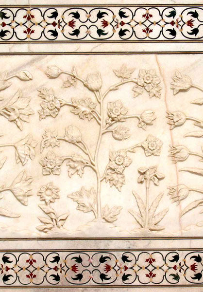 All over India, almost everyone we talked to asked us if we had been to the Taj Mahal yet. "Very Ro-mantic!," all the older ladies would swoon. Built by Mughal emperor Shah Jahan as a mausoleum for his favorite wife, its perfect symmetry, craftsmanship, and sheen are testaments to the depth of his love. The building was designed and built by Persian architects and workers, and the intricate inlay was done by Florentine workers! This shot is of a detail from the outside of the Taj, and is actually quiet large (maybe 4 feet high?). Wow!